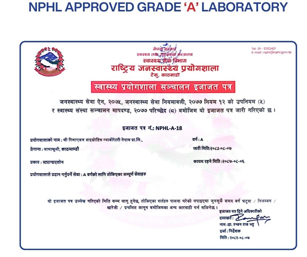 Reliable Diagnostic Laboratory Nepal is ISO 15189:2012 accredited; Fully Automated, Bar Coded; Network and run by trained Human Resource in Nepal, for accurate affordable and reliable report. ISO 15189:2012 Accredited-MLS-003 NPHL Registration No:NPHL-B-013 EXTERNAL QUALITY ASSURANCE SCHEME...