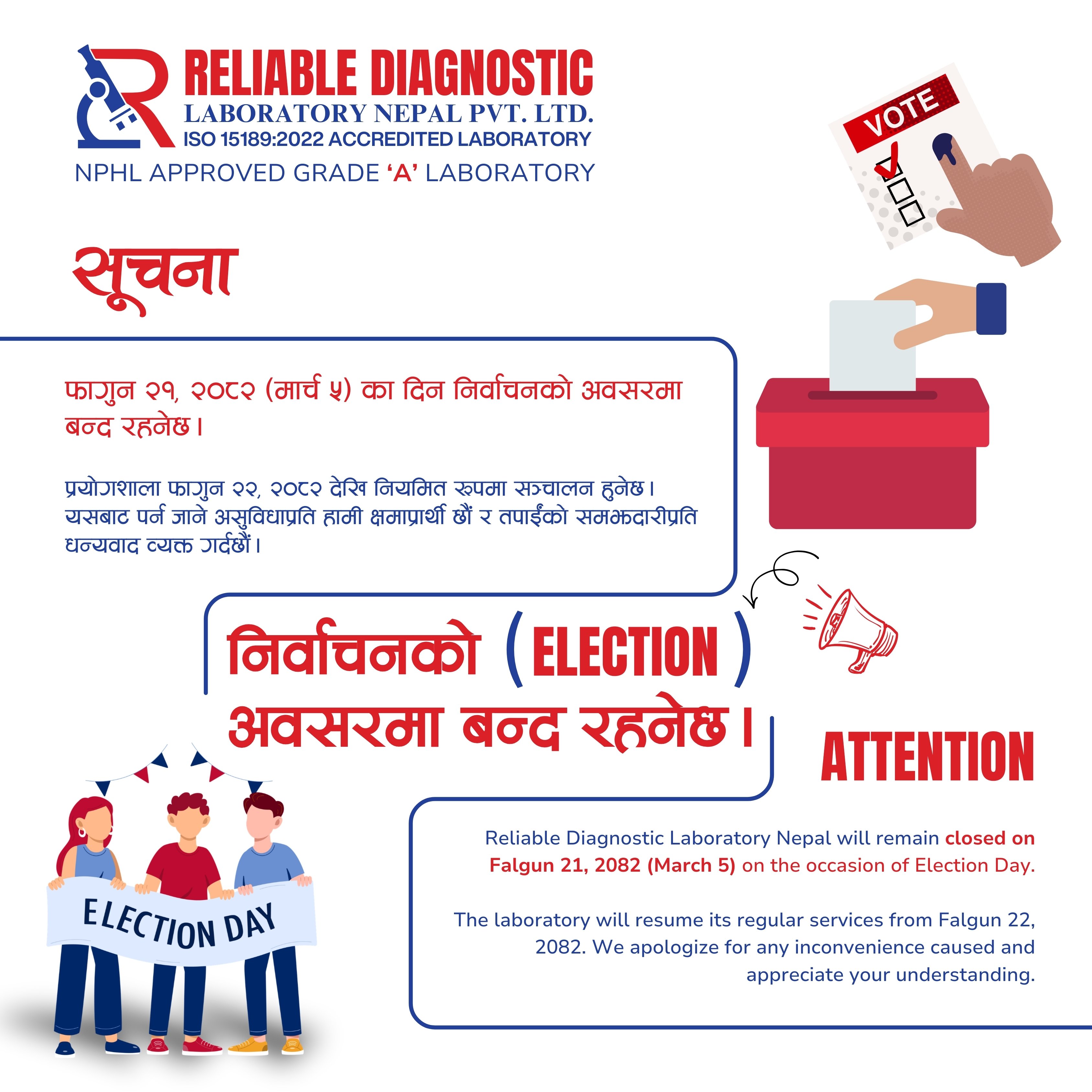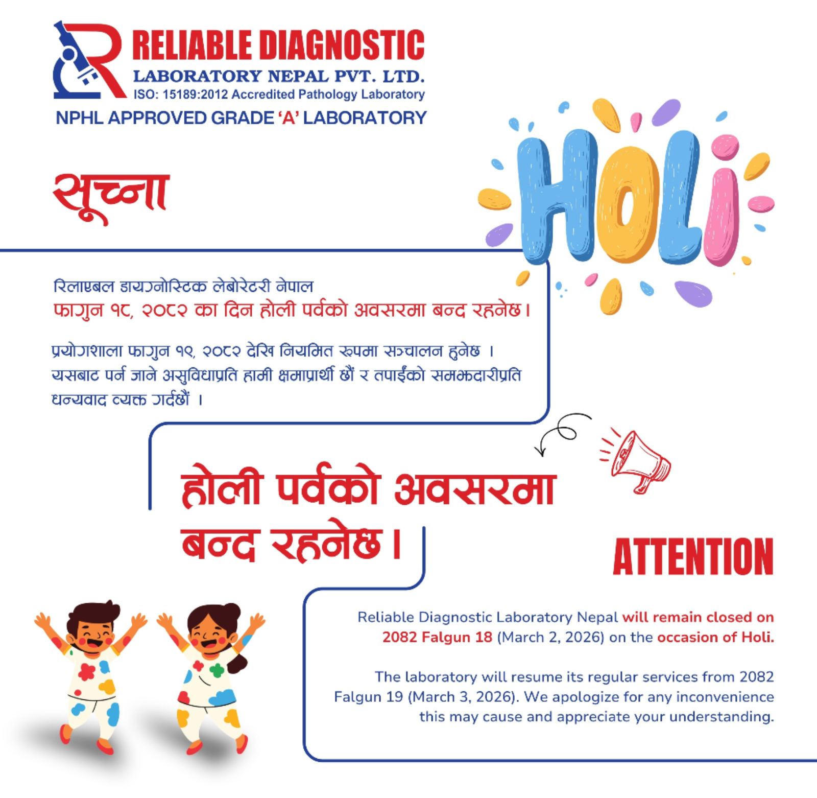 Reliable Diagnostic Laboratory Nepal is NPHL approved Grade "A" and ISO 15189:2012 accredited; Fully Automated, Bar Coded; Network and run by trained Human Resource in Nepal, for accurate affordable and reliable report.